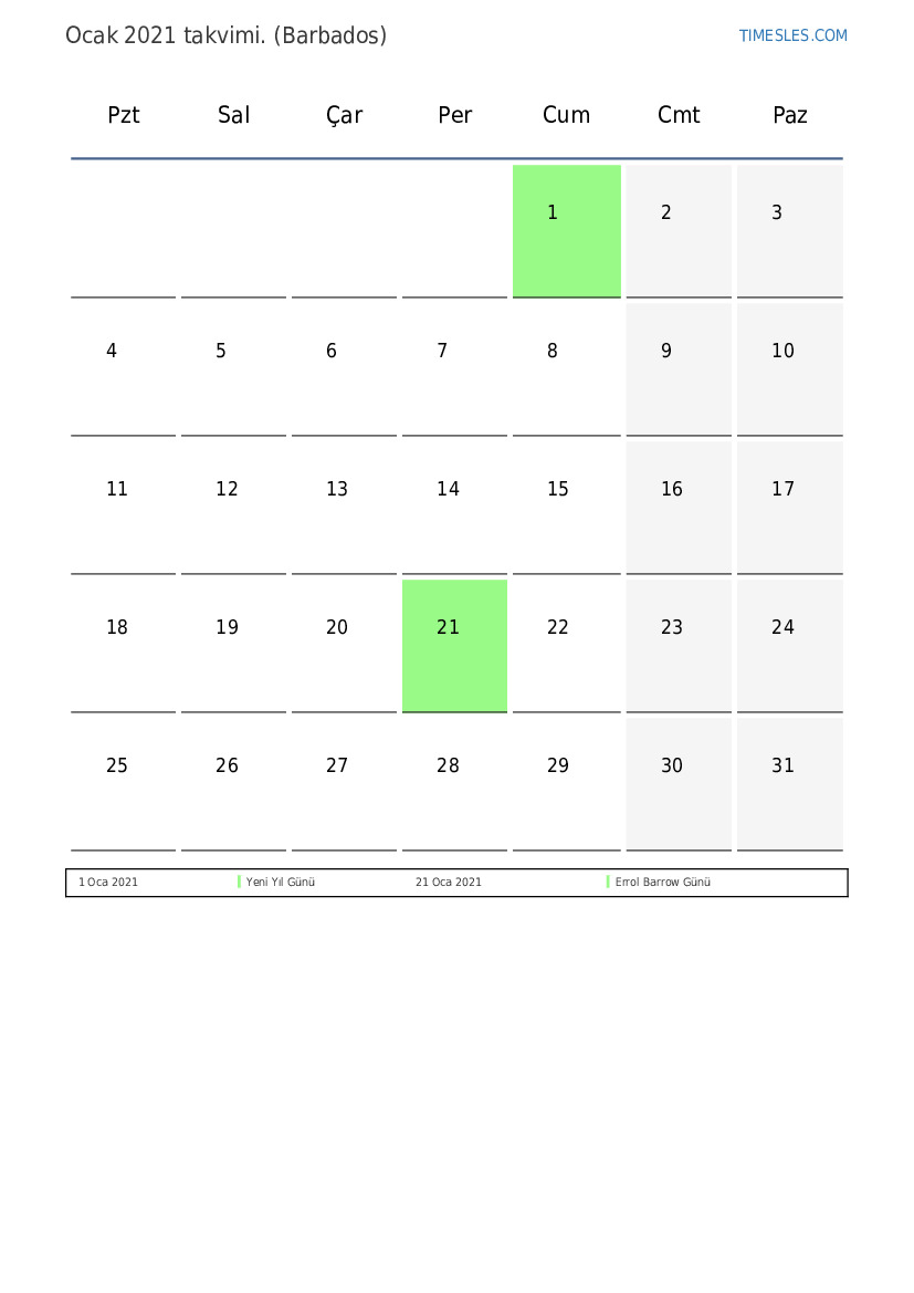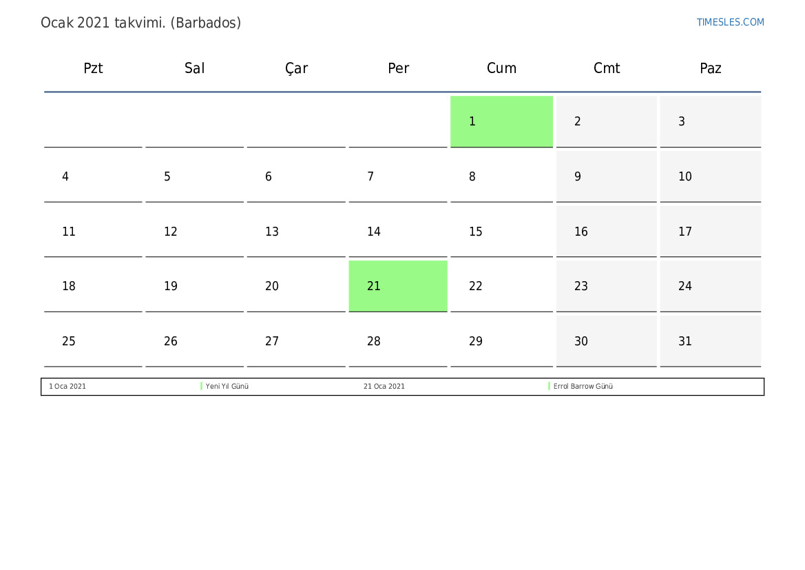 Barbados için Ocak 2021 Tatilleri ve Hafta Sonları Takvimi