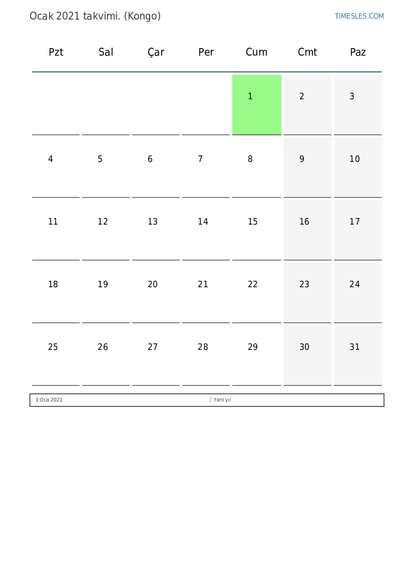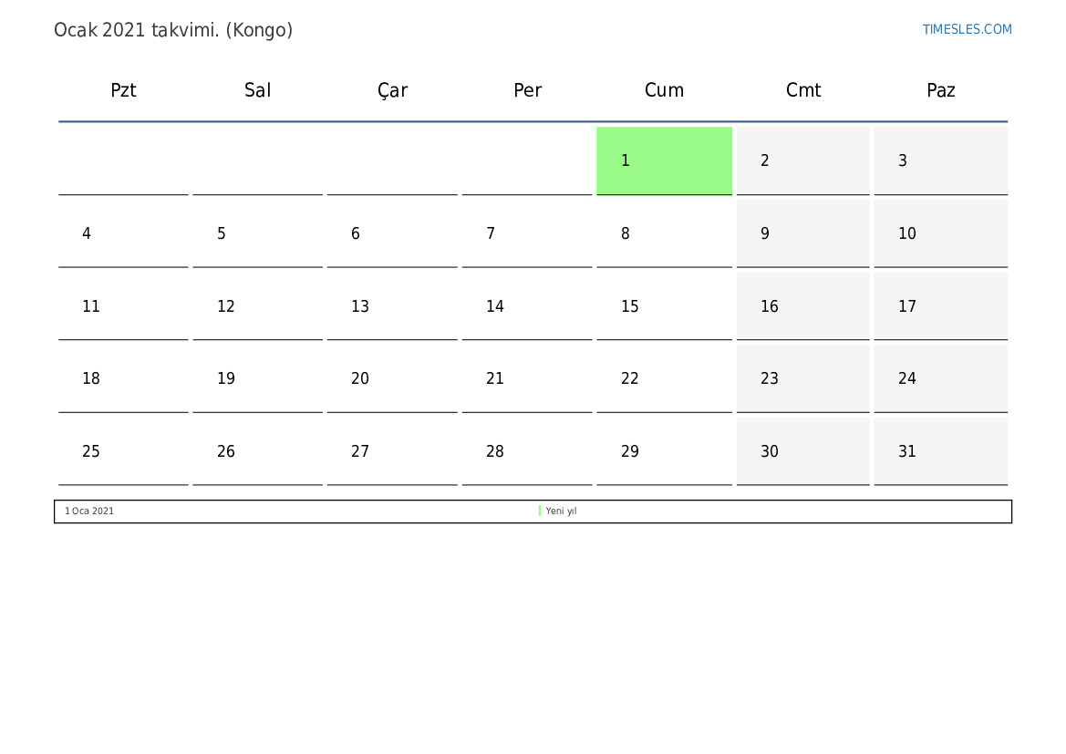Kongo için Ocak 2021 tatilleri ve hafta sonlarını içeren PDF takvimini indirin ve yazdırın
