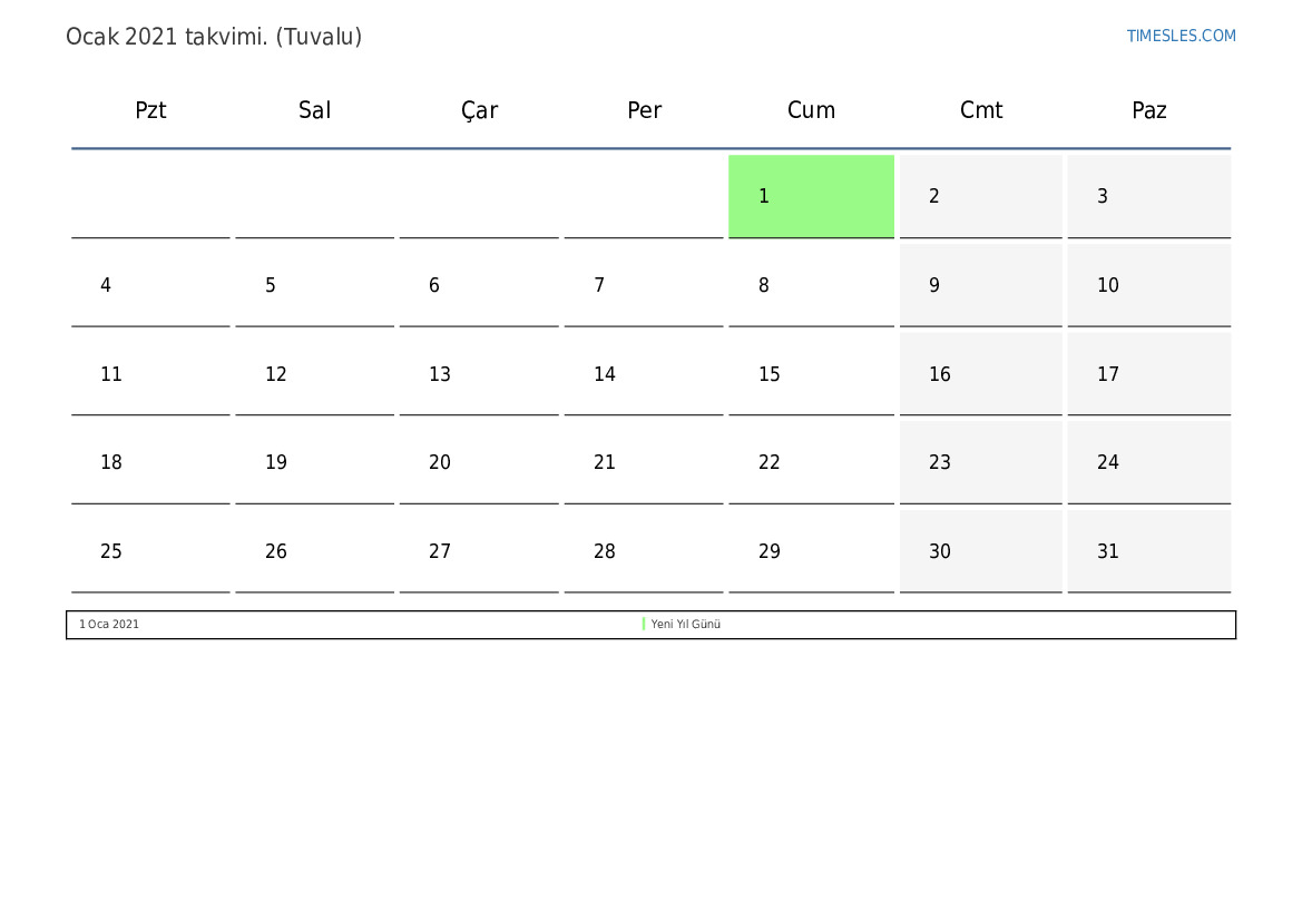 Tuvalu için Ocak 2021 tatilleri ve hafta sonlarını içeren PDF takvimini indirin ve yazdırın