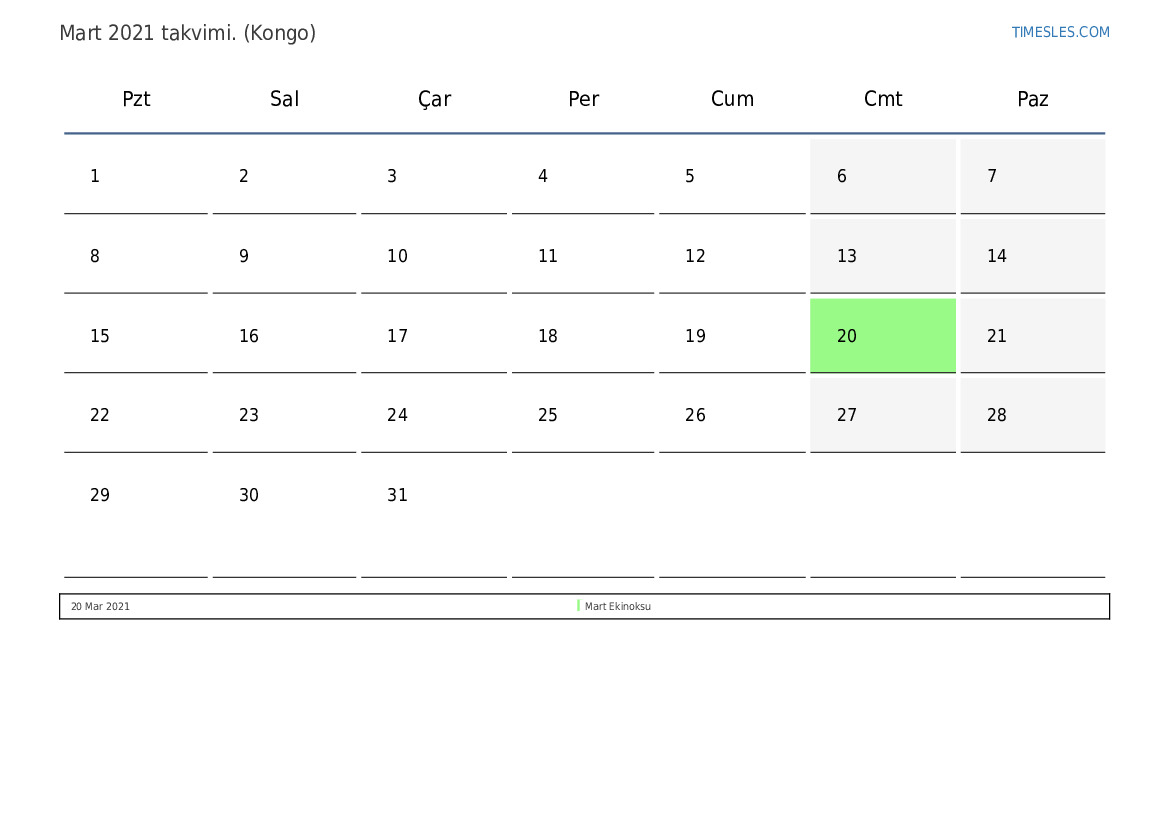 Mart ayı 31 gün. Bu, 2021'in 3 ayı. Yılın mevsimi: ilkbahar. Mart ayı Pazartesi gününde başlar ve Çarşamba günü biter. 2021 Mart ayında Kongo'da 1 tatil ve izin günü var.