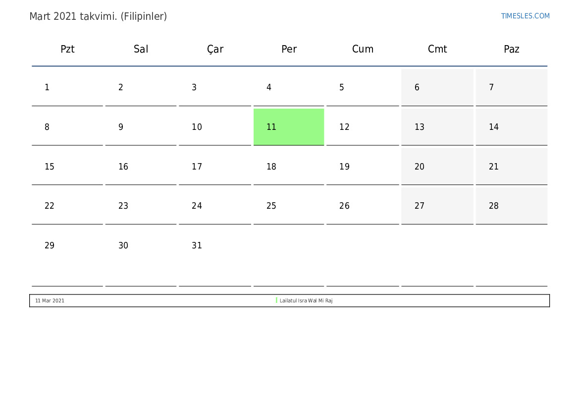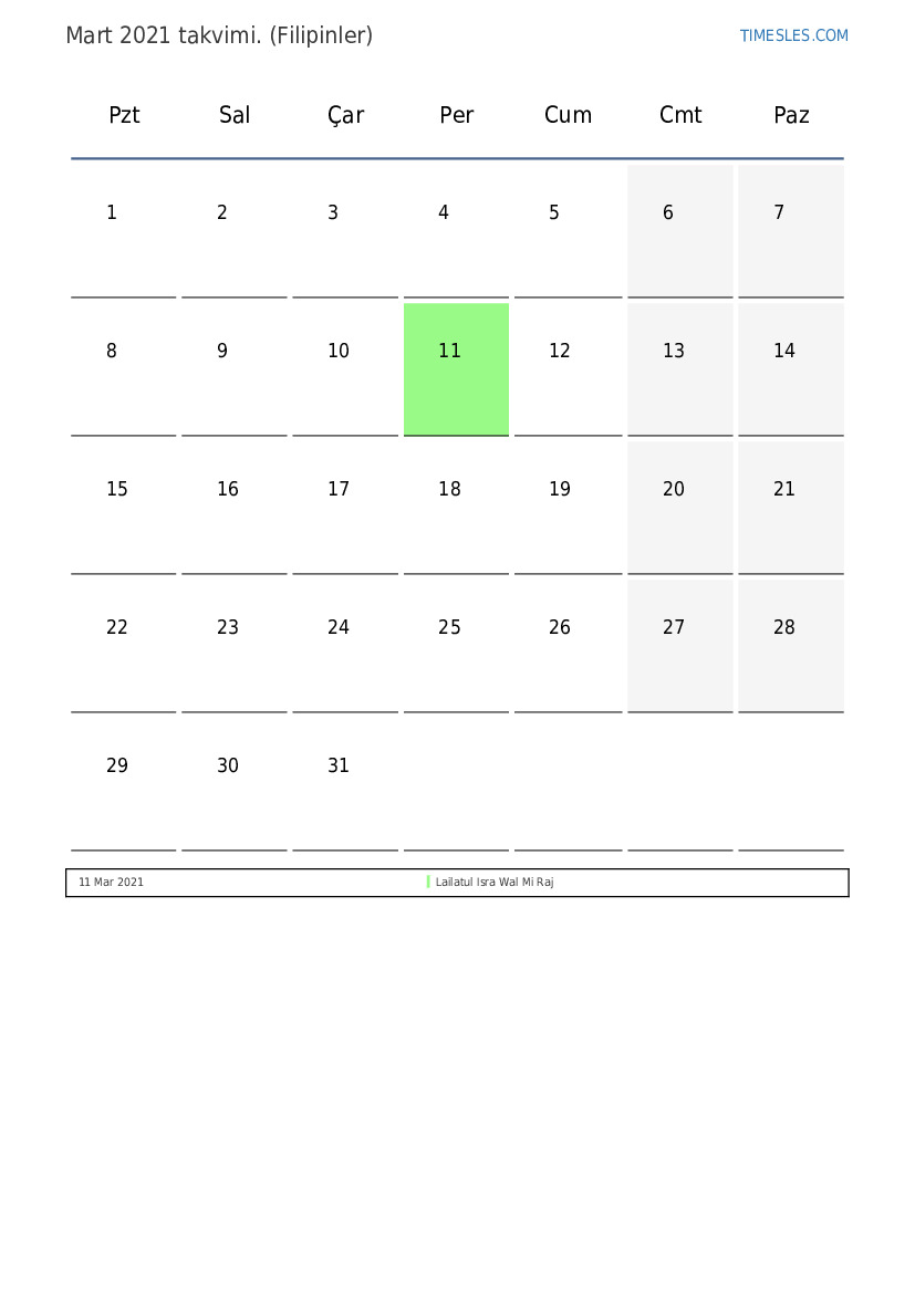 Filipinler için Mart 2021 takvimi