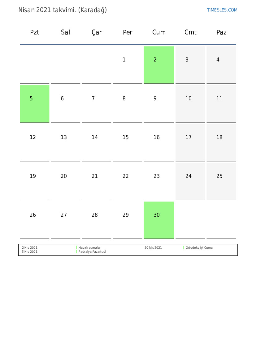 Karadağ için Nisan 2021 tatilleri ve hafta sonlarını içeren PDF takvimini indirin ve yazdırın