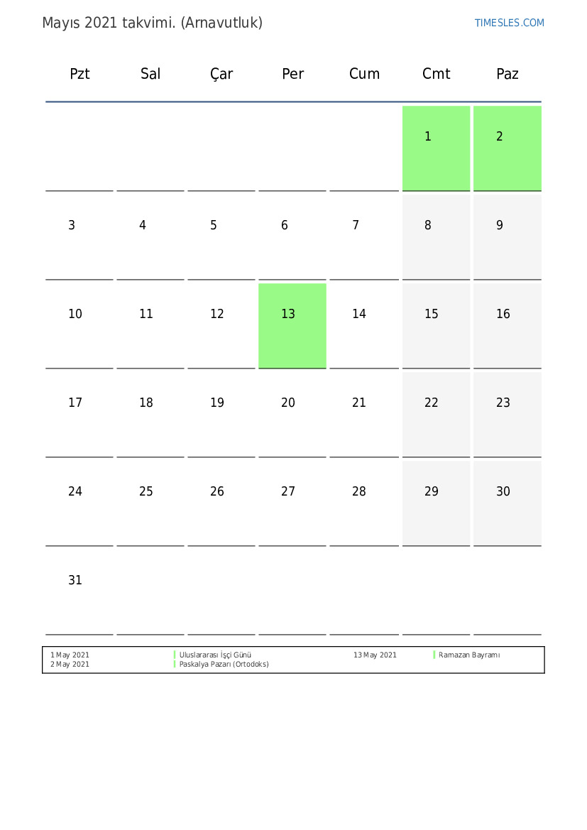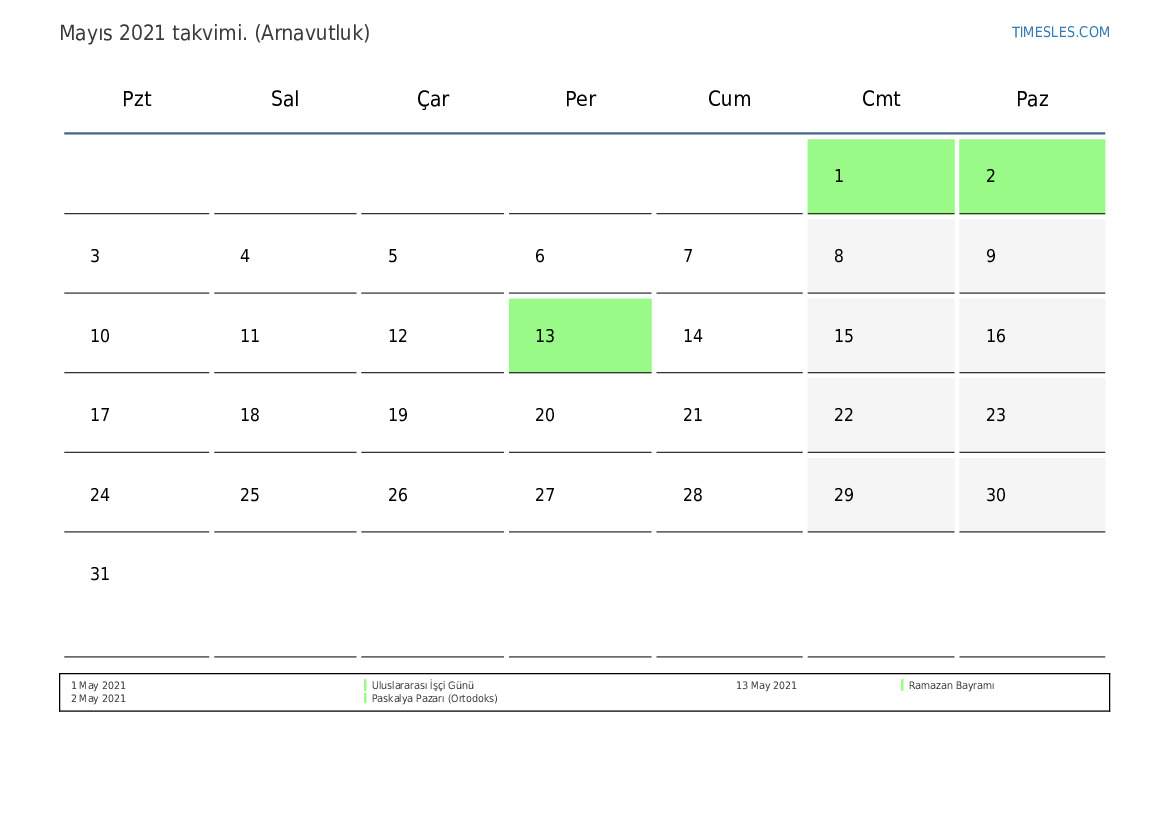 Arnavutluk için Mayıs 2021 tatilleri ve hafta sonlarını içeren PDF takvimini indirin ve yazdırın