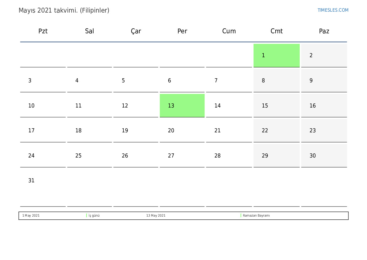 Filipinler için Mayıs 2021 tatilleri ve hafta sonlarını içeren PDF takvimini indirin ve yazdırın