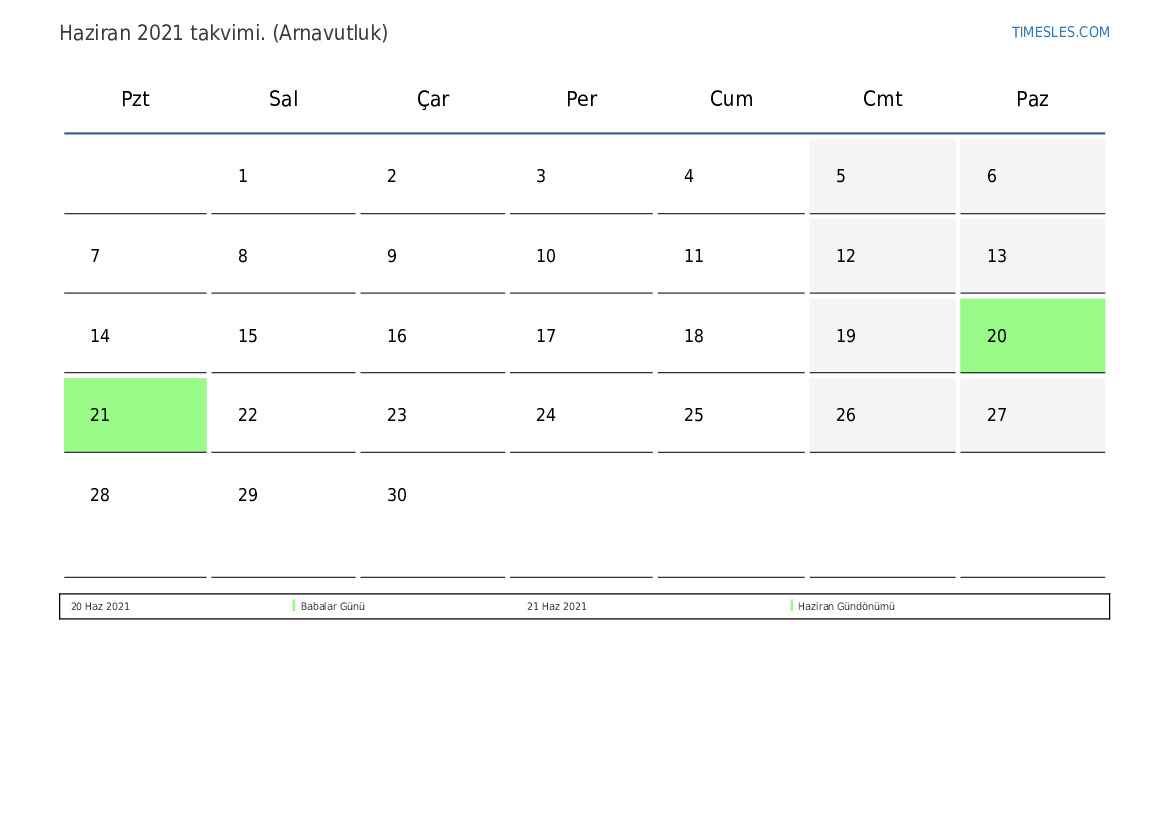 Arnavutluk için Haziran 2021 tatilleri ve hafta sonlarını içeren PDF takvimini indirin ve yazdırın