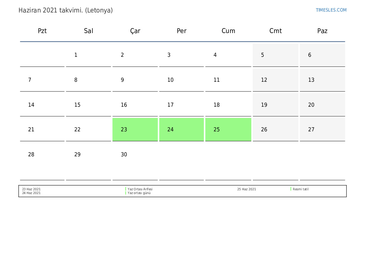 Letonya için Haziran 2021 Tatilleri ve Hafta Sonları Takvimi