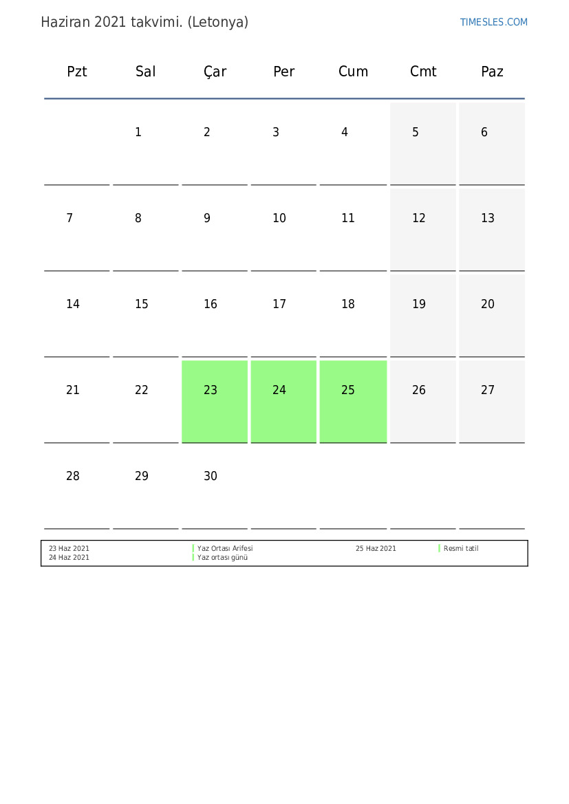 Letonya için Haziran 2021 tatilleri ve hafta sonlarını içeren PDF takvimini indirin ve yazdırın