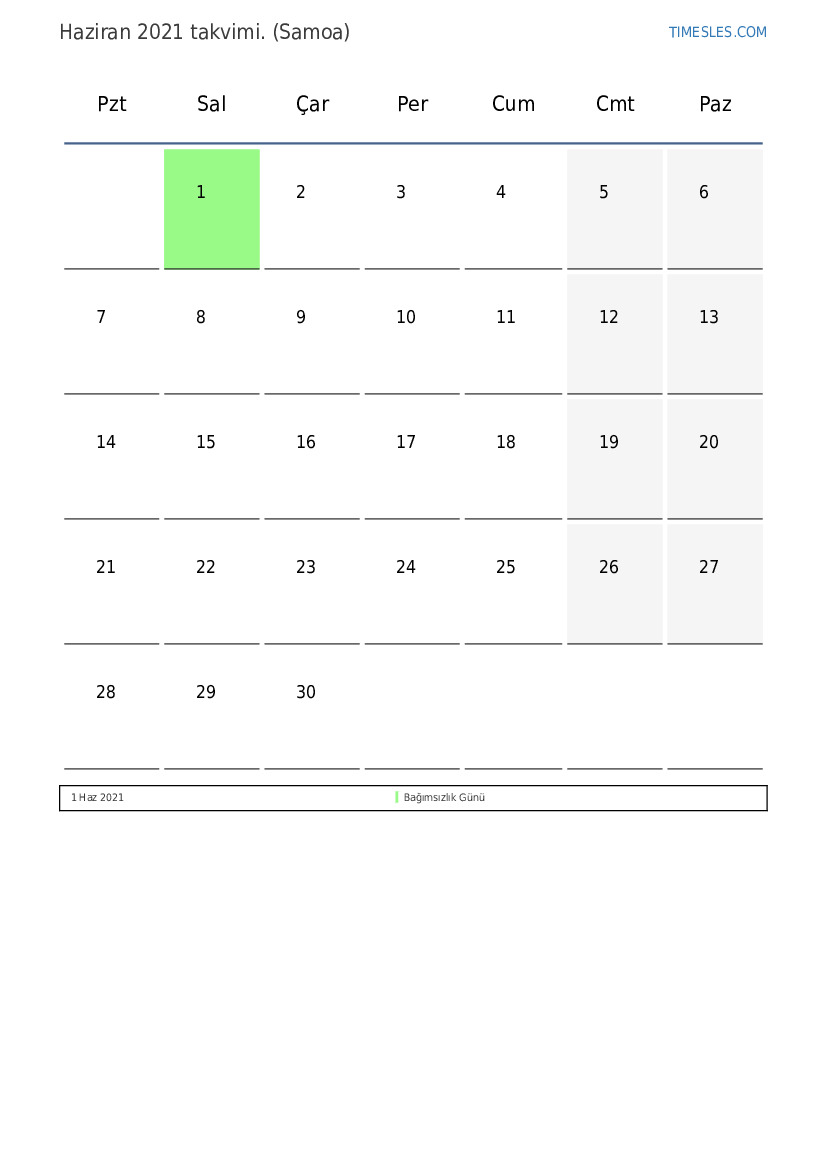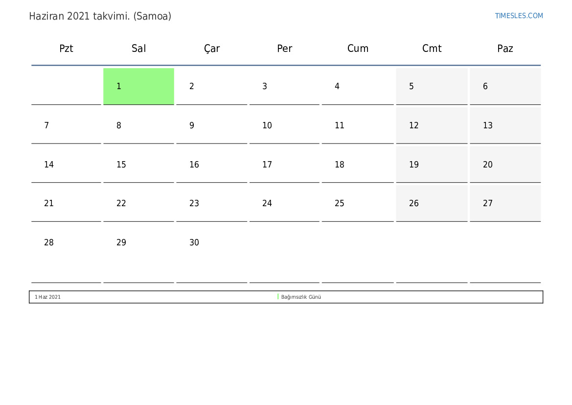 Samoa için Haziran 2021 tatilleri ve hafta sonlarını içeren PDF takvimini indirin ve yazdırın