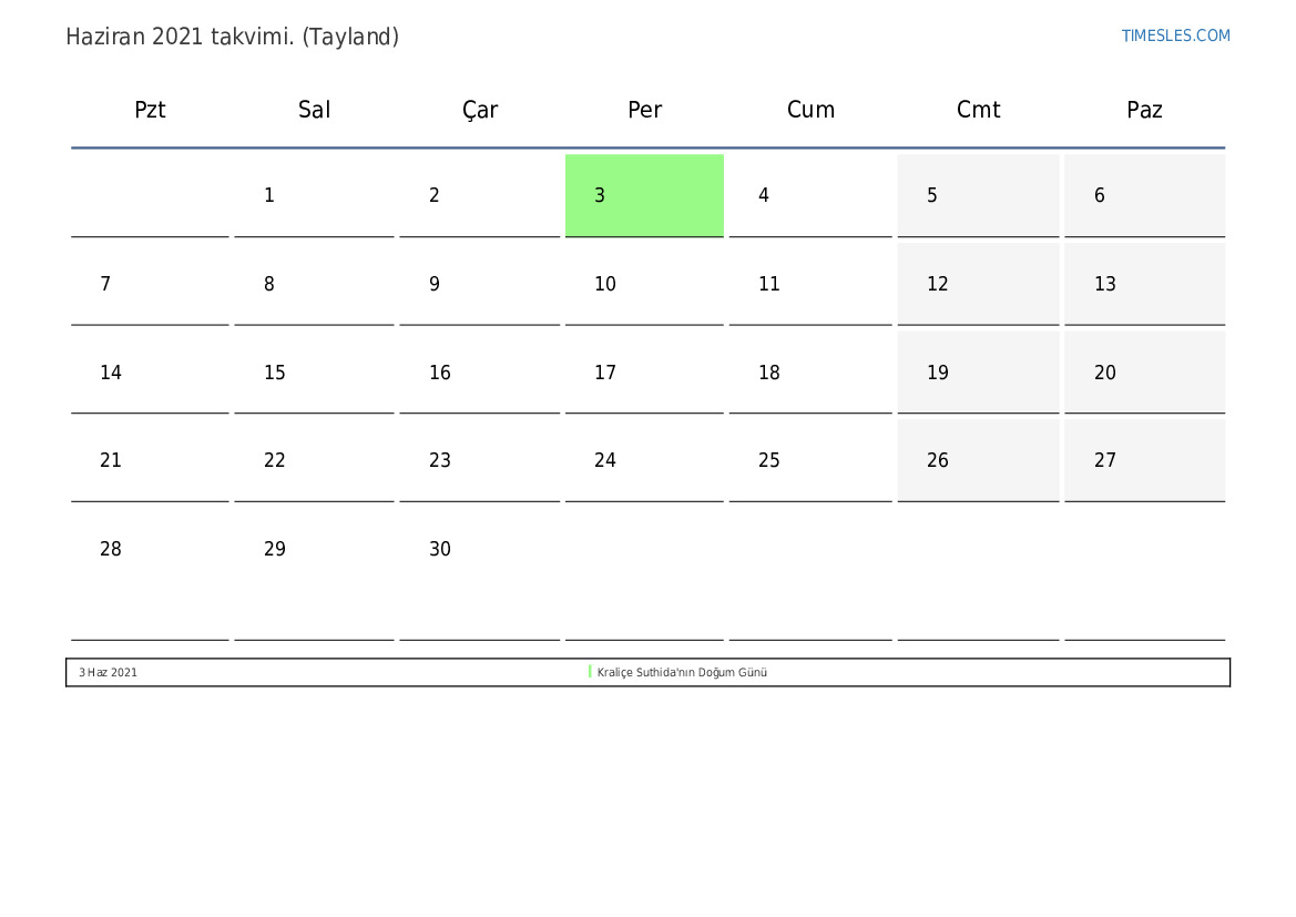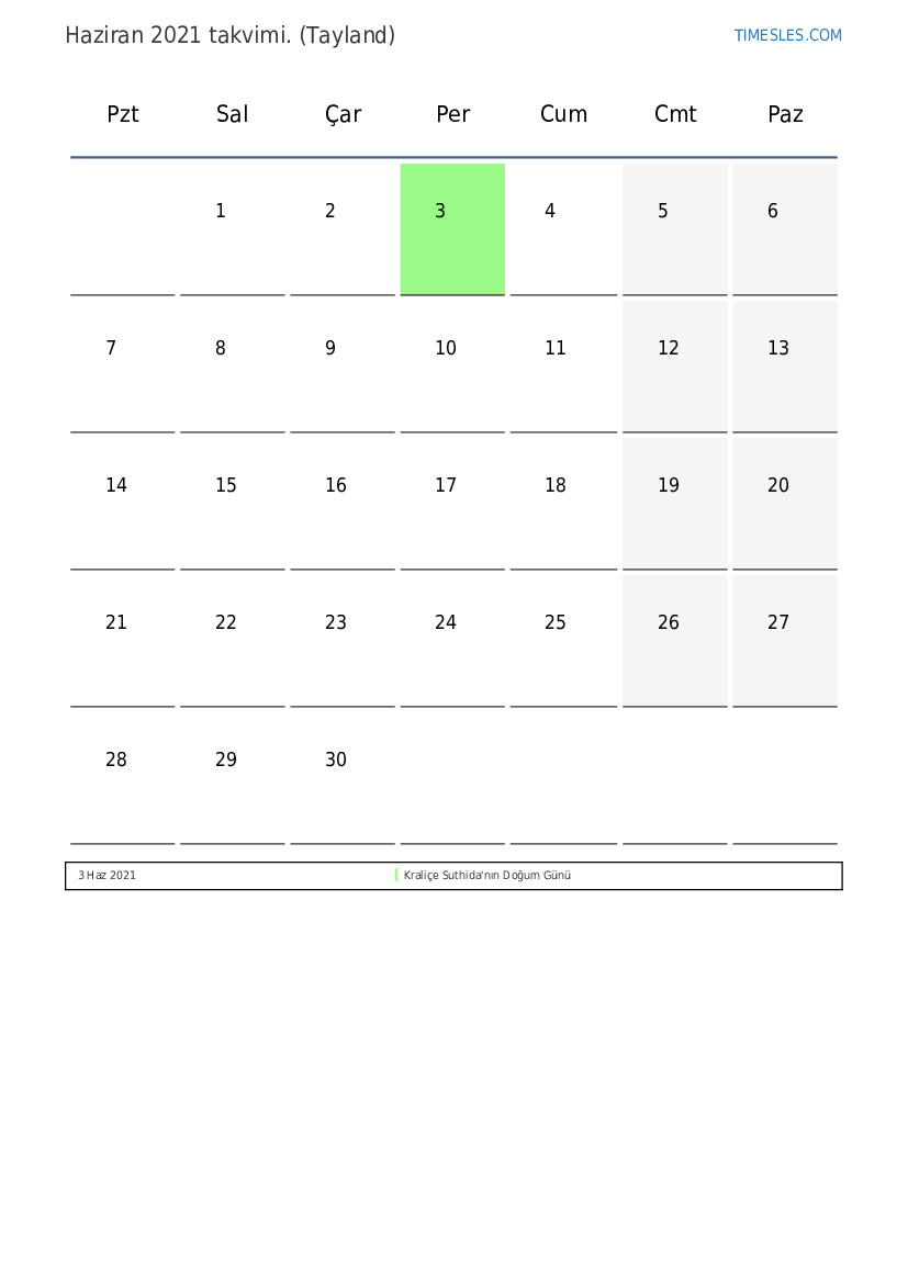 Tayland için Haziran 2021 tatilleri ve hafta sonlarını içeren PDF takvimini indirin ve yazdırın