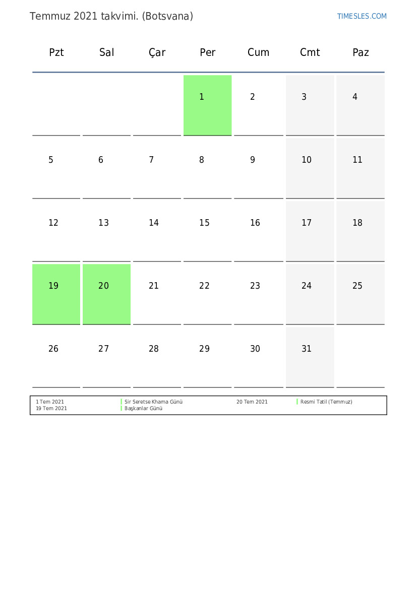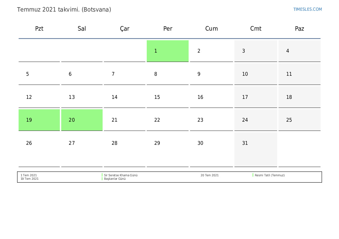 Botsvana için Temmuz 2021 tatilleri ve hafta sonlarını içeren PDF takvimini indirin ve yazdırın