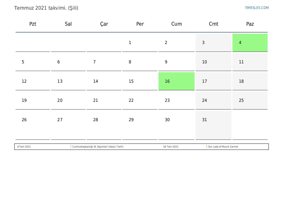 Temmuz ayı 31 gün. Bu, 2021'in 7 ayı. Yılın mevsimi: yaz. Temmuz ayı Perşembe günü başlar ve Cumartesi günü biter. 2021 Temmuz ayında Şili'de 2 tatil ve tatil günleri var.