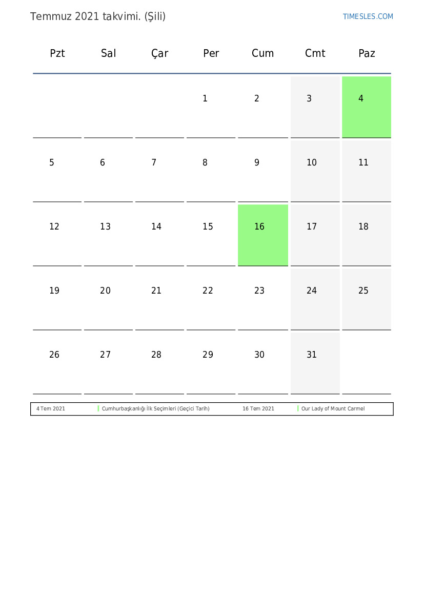 Şili için Temmuz 2021 Tatilleri ve Hafta Sonları Takvimi