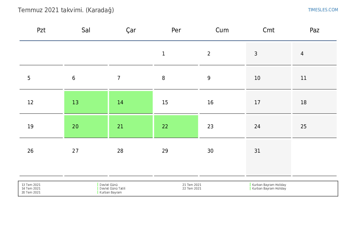 Karadağ için Temmuz 2021 tatilleri ve hafta sonlarını içeren PDF takvimini indirin ve yazdırın
