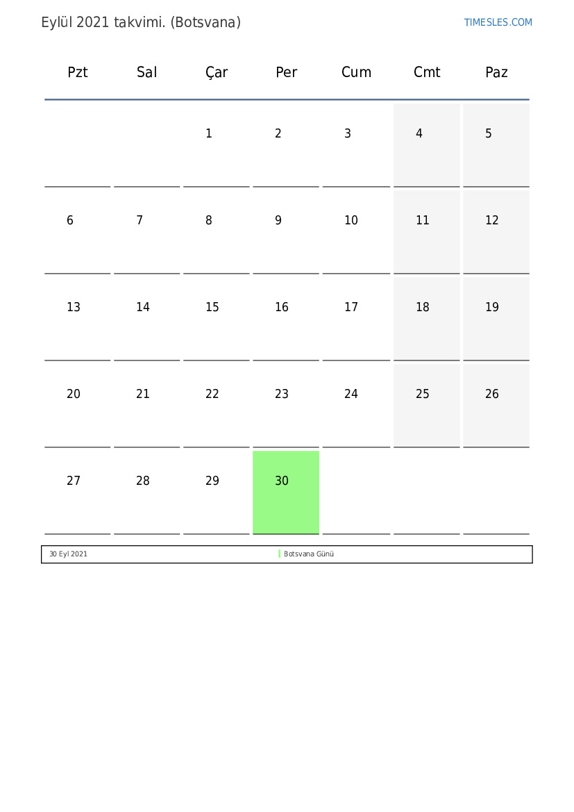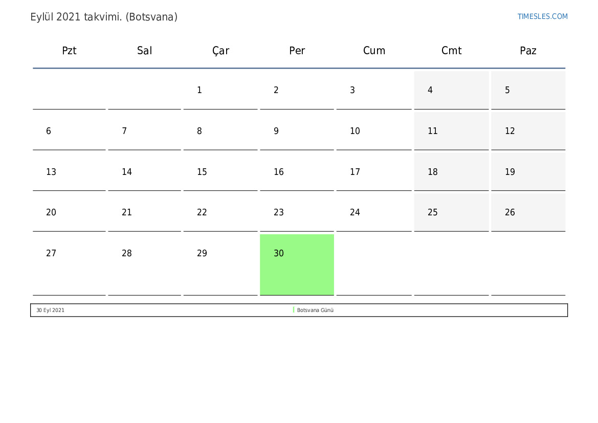 Botsvana için Eylül 2021 tatilleri ve hafta sonlarını içeren PDF takvimini indirin ve yazdırın