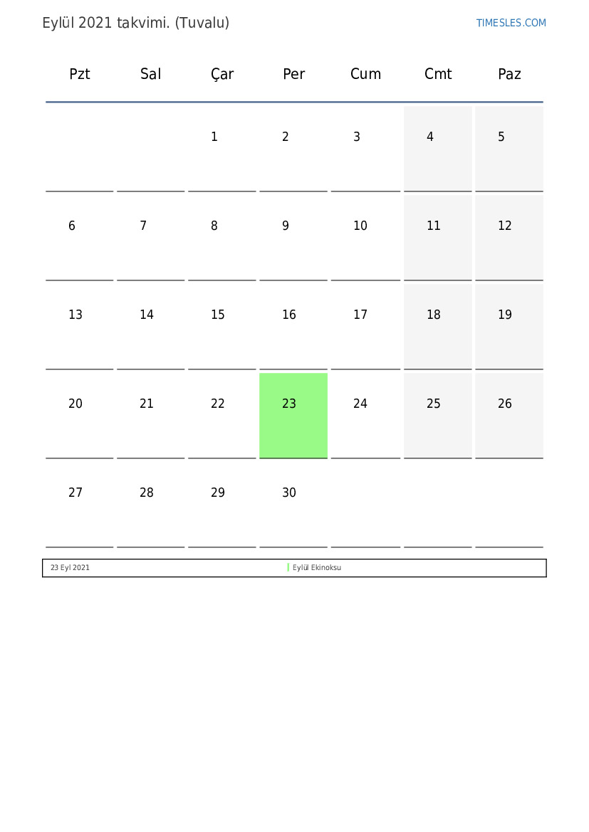 Eylül ayı 30 gün. Bu, 2021'in 9 ayı. Yılın mevsimi: sonbahar. Eylül ayı Çarşamba günü başlar ve Perşembe günü biter. 2021 Eylül ayında Tuvalu'da 1 tatil ve izin günü var.