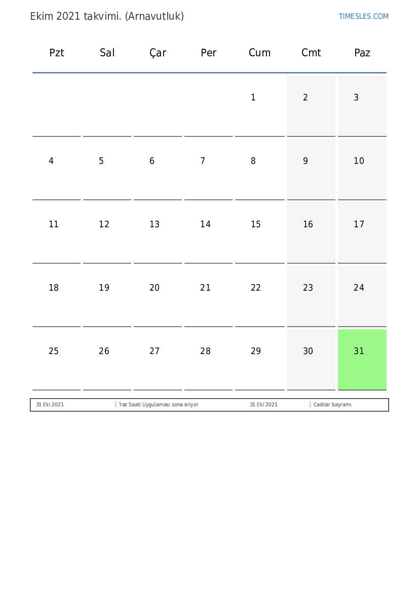 Arnavutluk için Ekim 2021 tatilleri ve hafta sonlarını içeren PDF takvimini indirin ve yazdırın