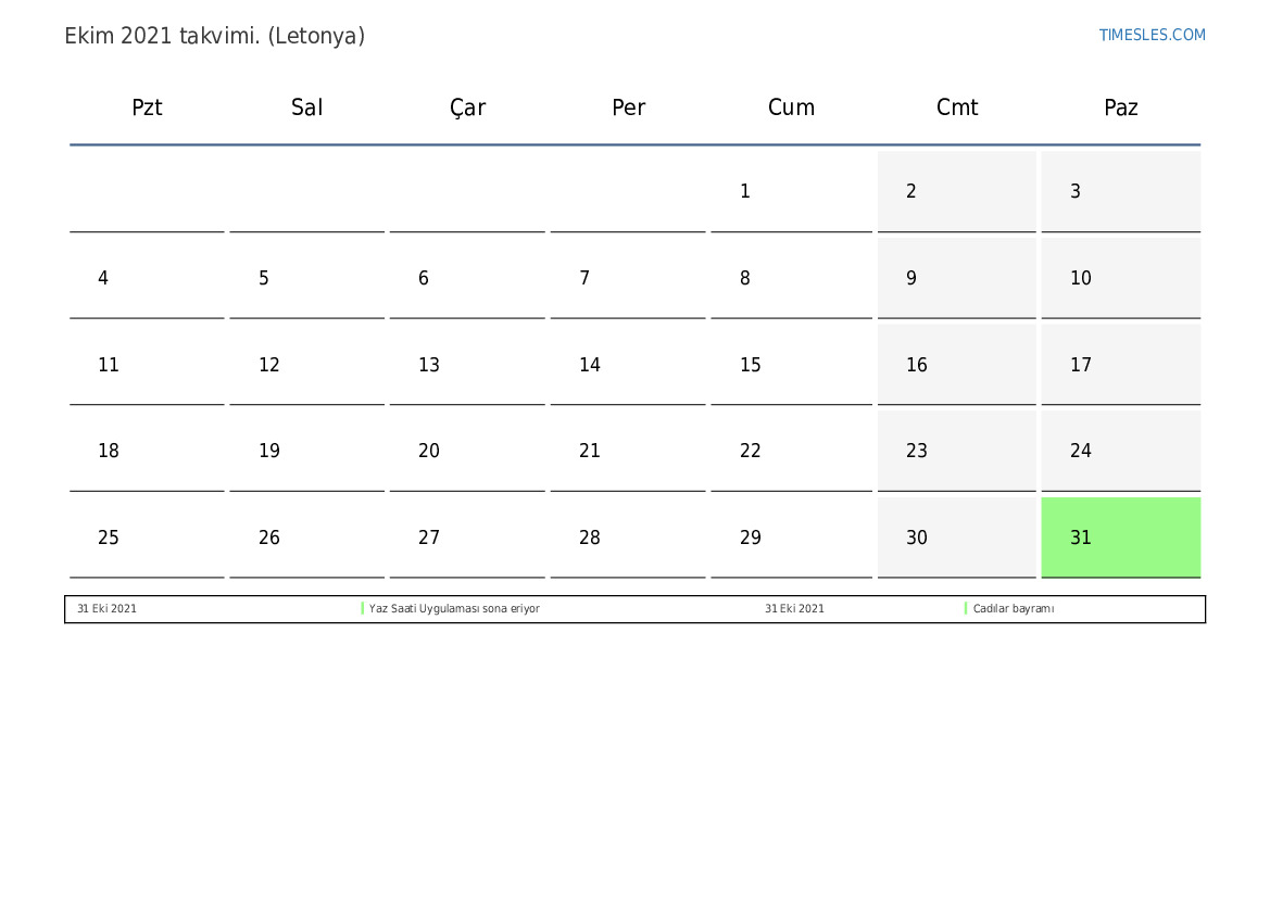 Letonya için Ekim 2021 Tatilleri ve Hafta Sonları Takvimi