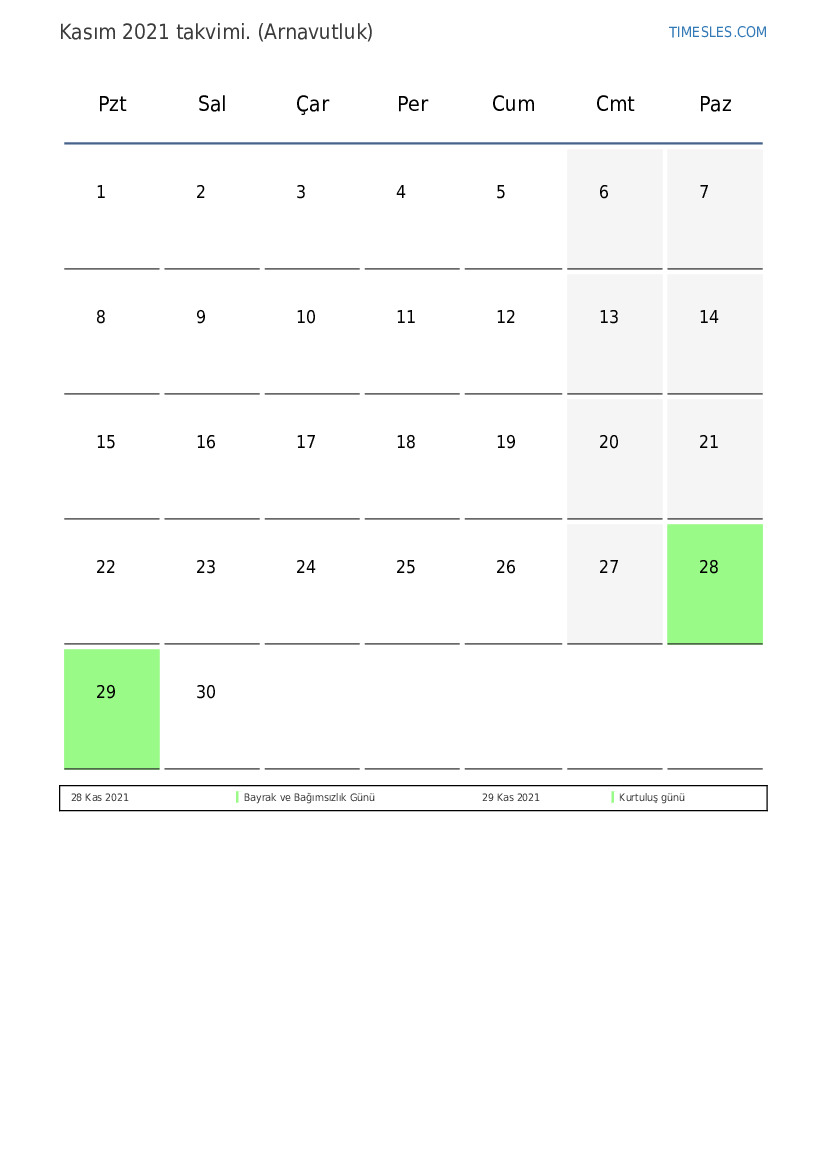 Arnavutluk için Kasım 2021 Tatilleri ve Hafta Sonları Takvimi