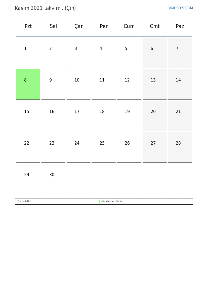Çin için Kasım 2021 tatilleri ve hafta sonlarını içeren PDF takvimini indirin ve yazdırın