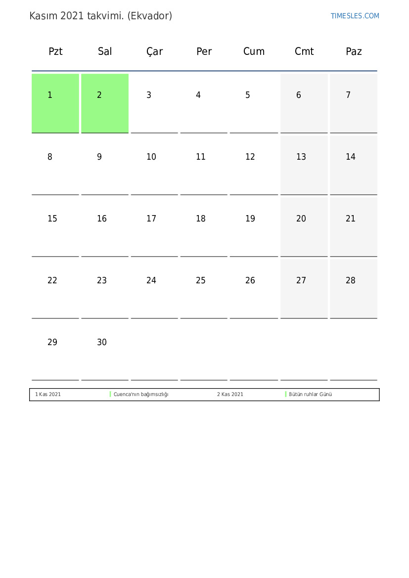 Ekvador için Kasım 2021 tatilleri ve hafta sonlarını içeren PDF takvimini indirin ve yazdırın