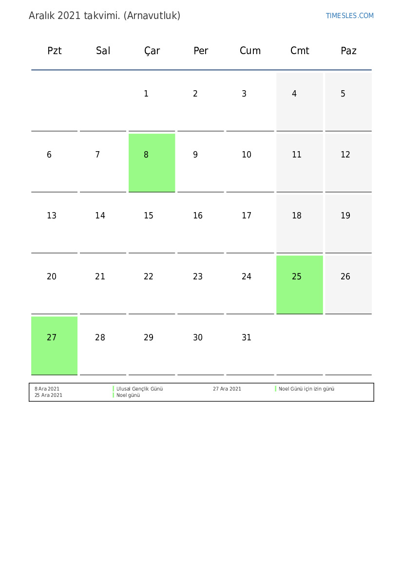 Arnavutluk için Aralık 2021 tatilleri ve hafta sonlarını içeren PDF takvimini indirin ve yazdırın