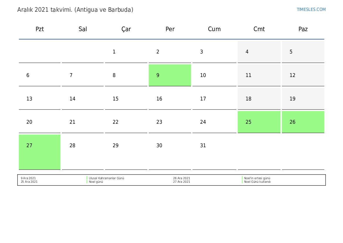 Antigua ve Barbuda için Aralık 2021 Tatilleri ve Hafta Sonları Takvimi