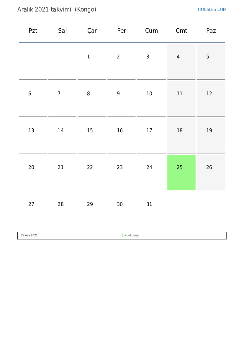 Kongo için Aralık 2021 tatilleri ve hafta sonlarını içeren PDF takvimini indirin ve yazdırın