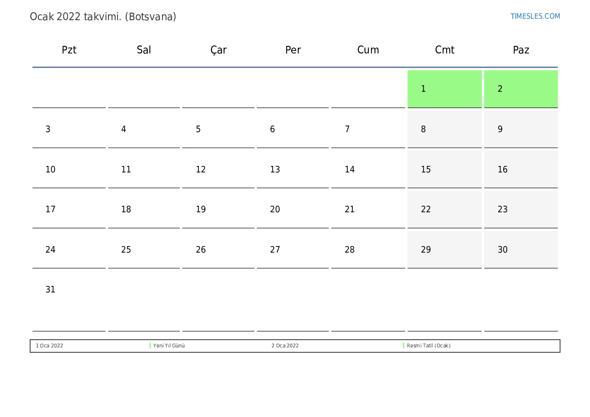 Botsvana için Ocak 2022 tatilleri ve hafta sonlarını içeren PDF takvimini indirin ve yazdırın