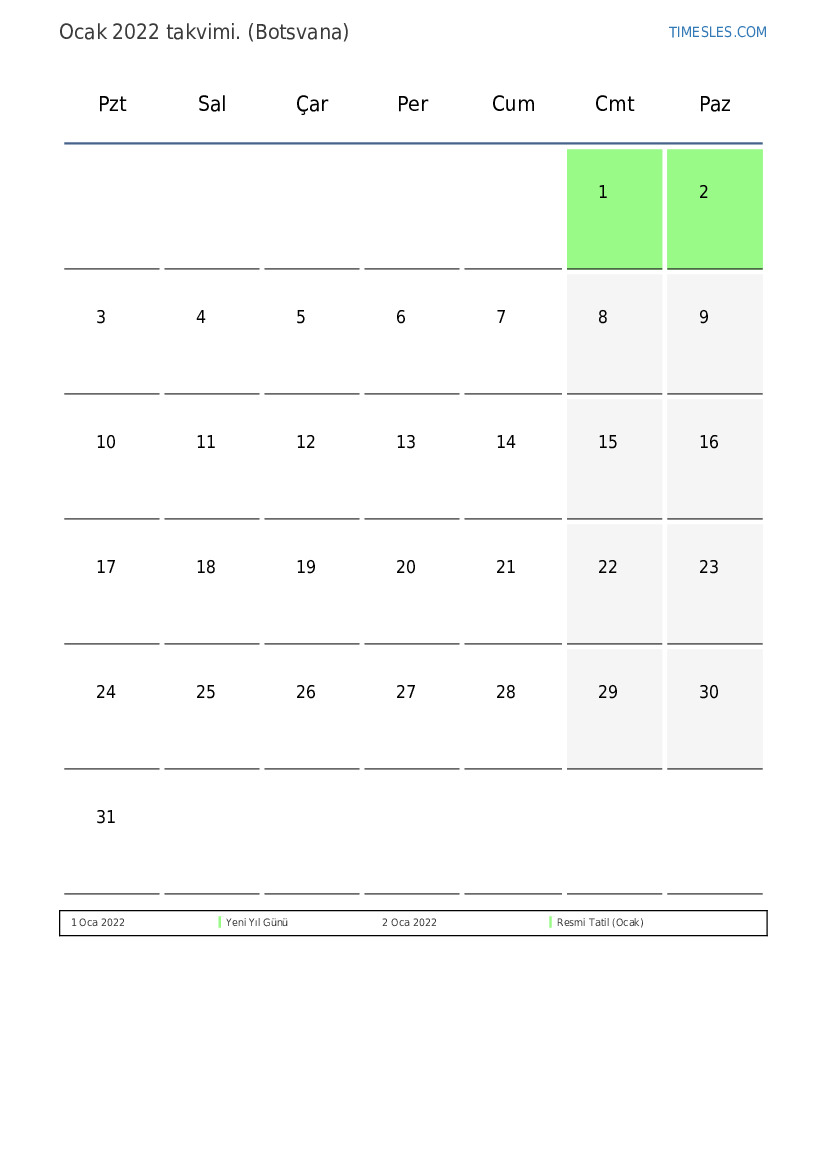 Botsvana için Ocak 2022 Tatilleri ve Hafta Sonları Takvimi