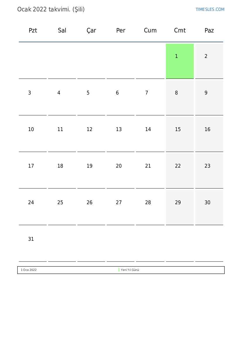 Şili için Ocak 2022 Tatilleri ve Hafta Sonları Takvimi