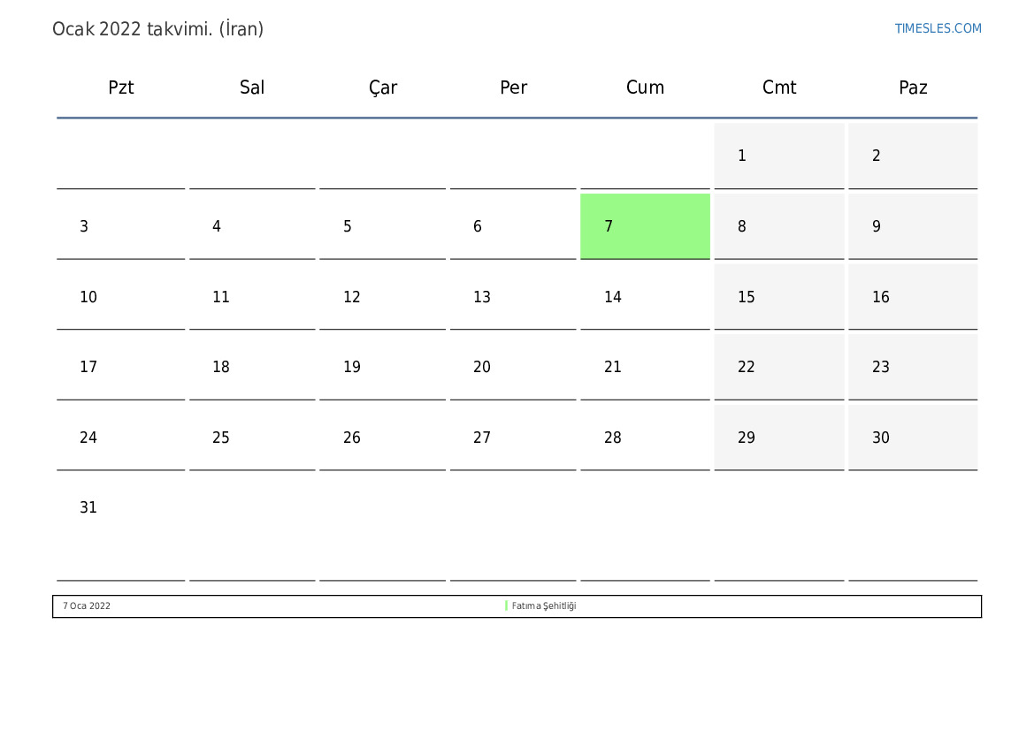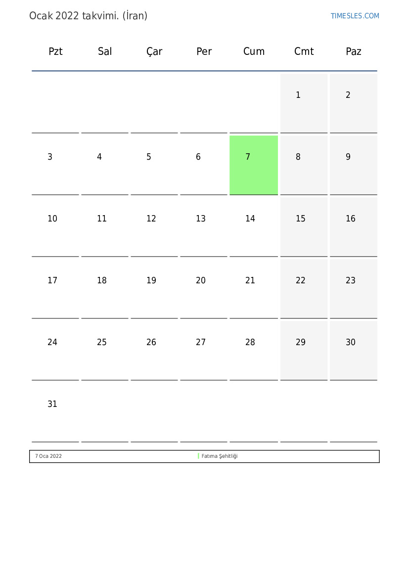 İran için Ocak 2022 tatilleri ve hafta sonlarını içeren PDF takvimini indirin ve yazdırın