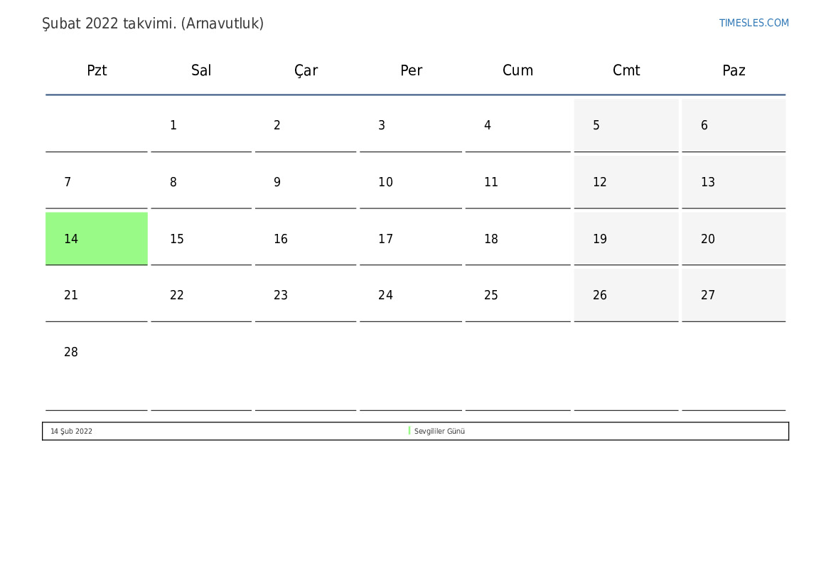 Arnavutluk için Şubat 2022 tatilleri ve hafta sonlarını içeren PDF takvimini indirin ve yazdırın