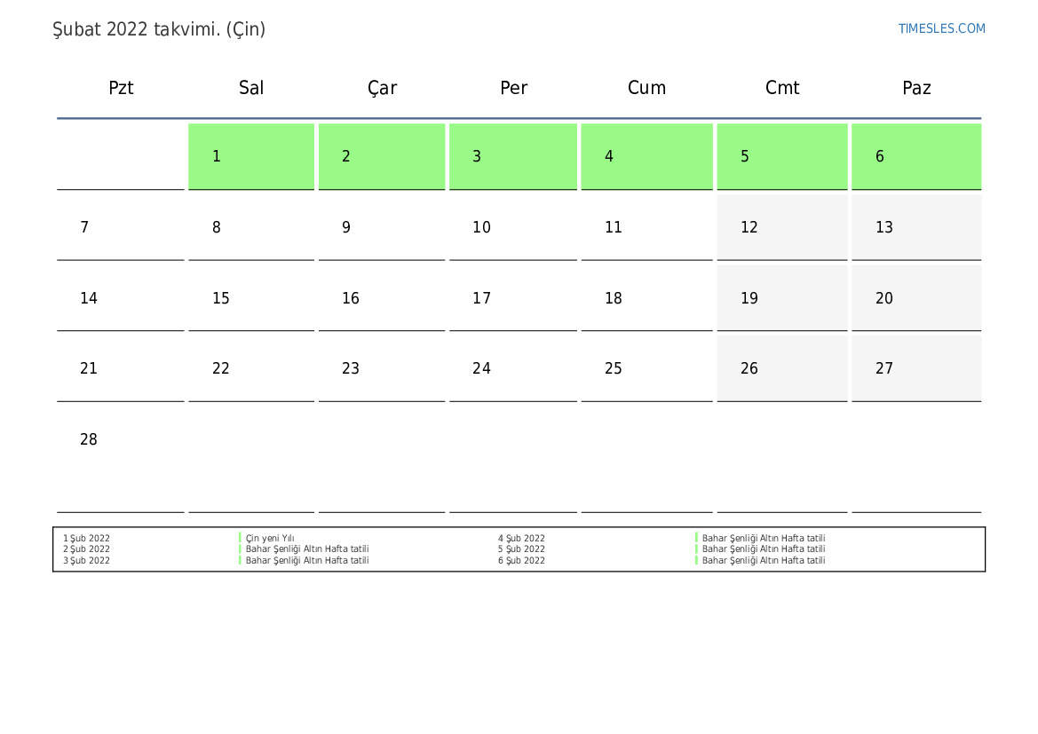 Çin için Şubat 2022 Tatilleri ve Hafta Sonları Takvimi