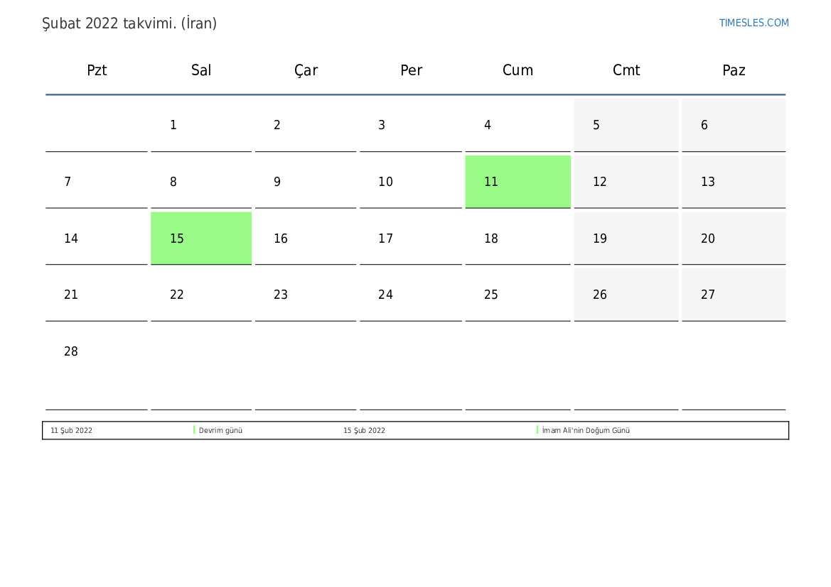 İran için Şubat 2022 tatilleri ve hafta sonlarını içeren PDF takvimini indirin ve yazdırın