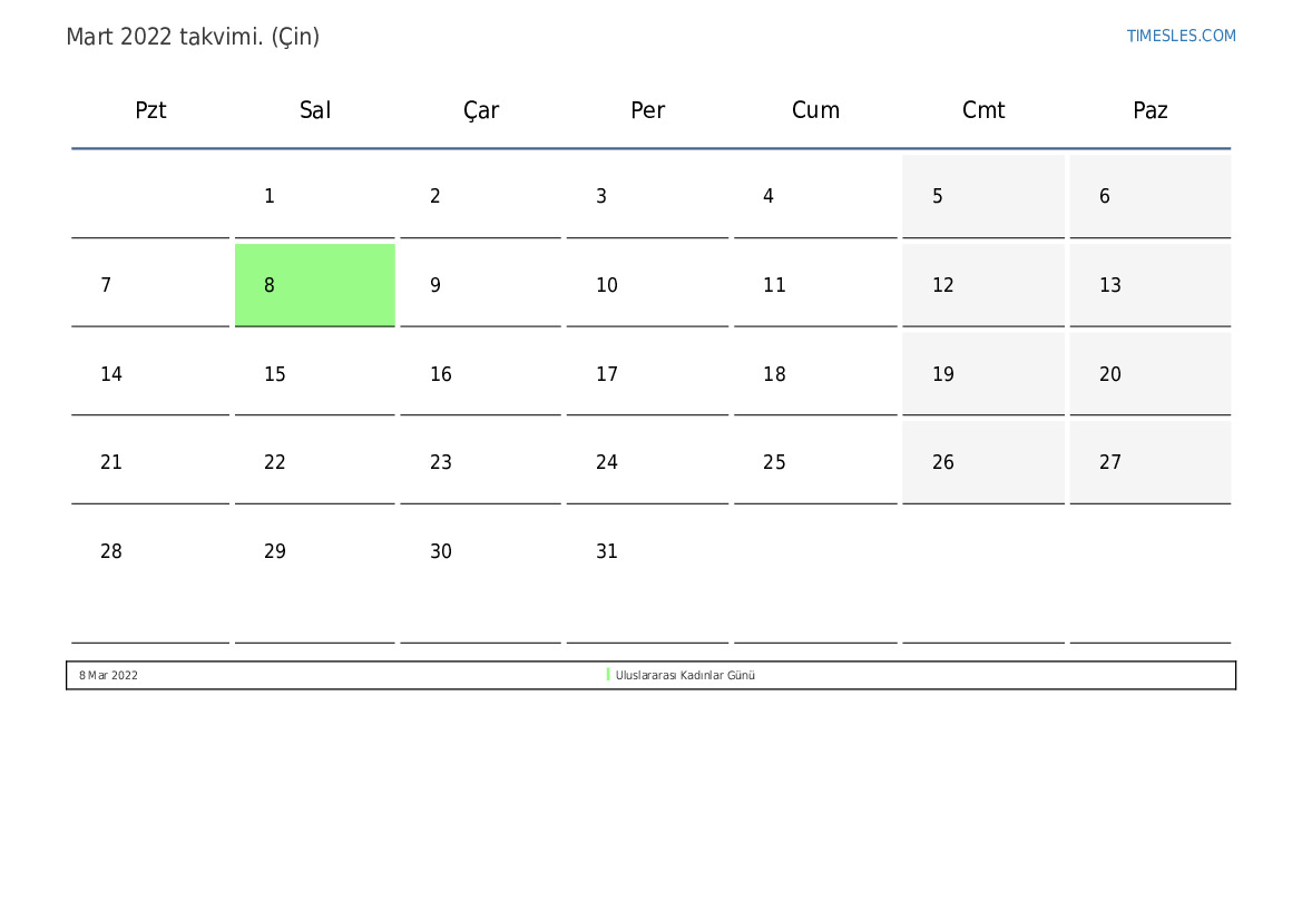 Çin için Mart 2022 takvimi