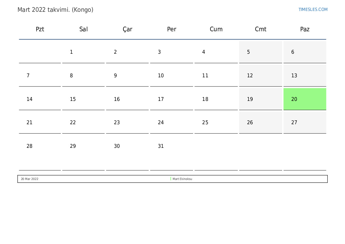 Kongo için Mart 2022 tatilleri ve hafta sonlarını içeren PDF takvimini indirin ve yazdırın