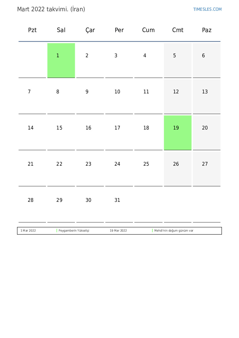 İran için Mart 2022 Tatilleri ve Hafta Sonları Takvimi