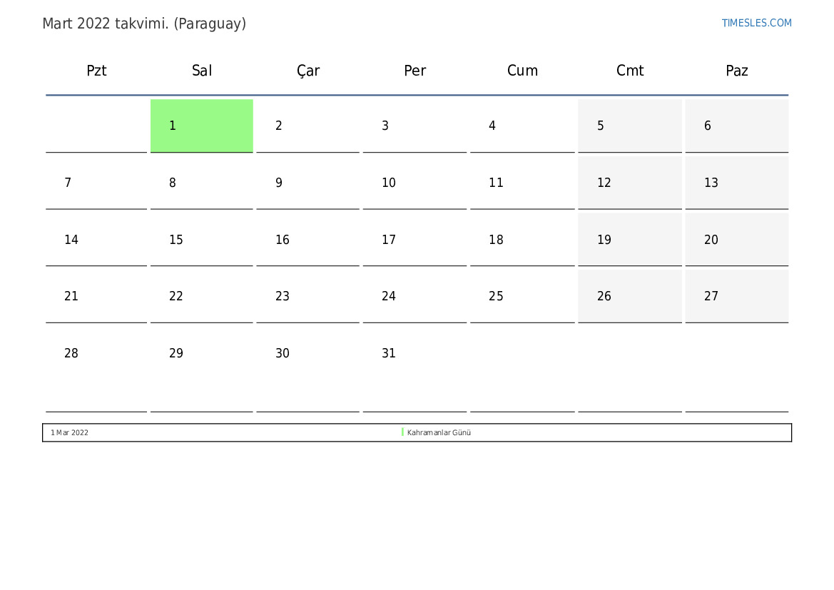 Paraguay için Mart 2022 Tatilleri ve Hafta Sonları Takvimi