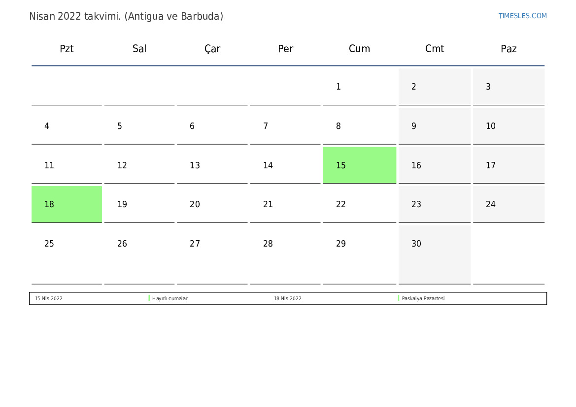 Antigua ve Barbuda için Nisan 2022 Tatilleri ve Hafta Sonları Takvimi