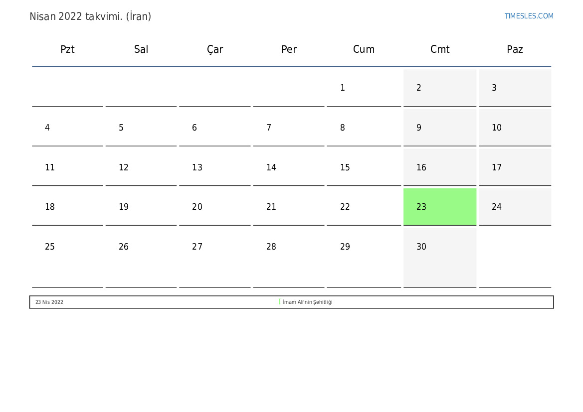 İran için Nisan 2022 tatilleri ve hafta sonlarını içeren PDF takvimini indirin ve yazdırın