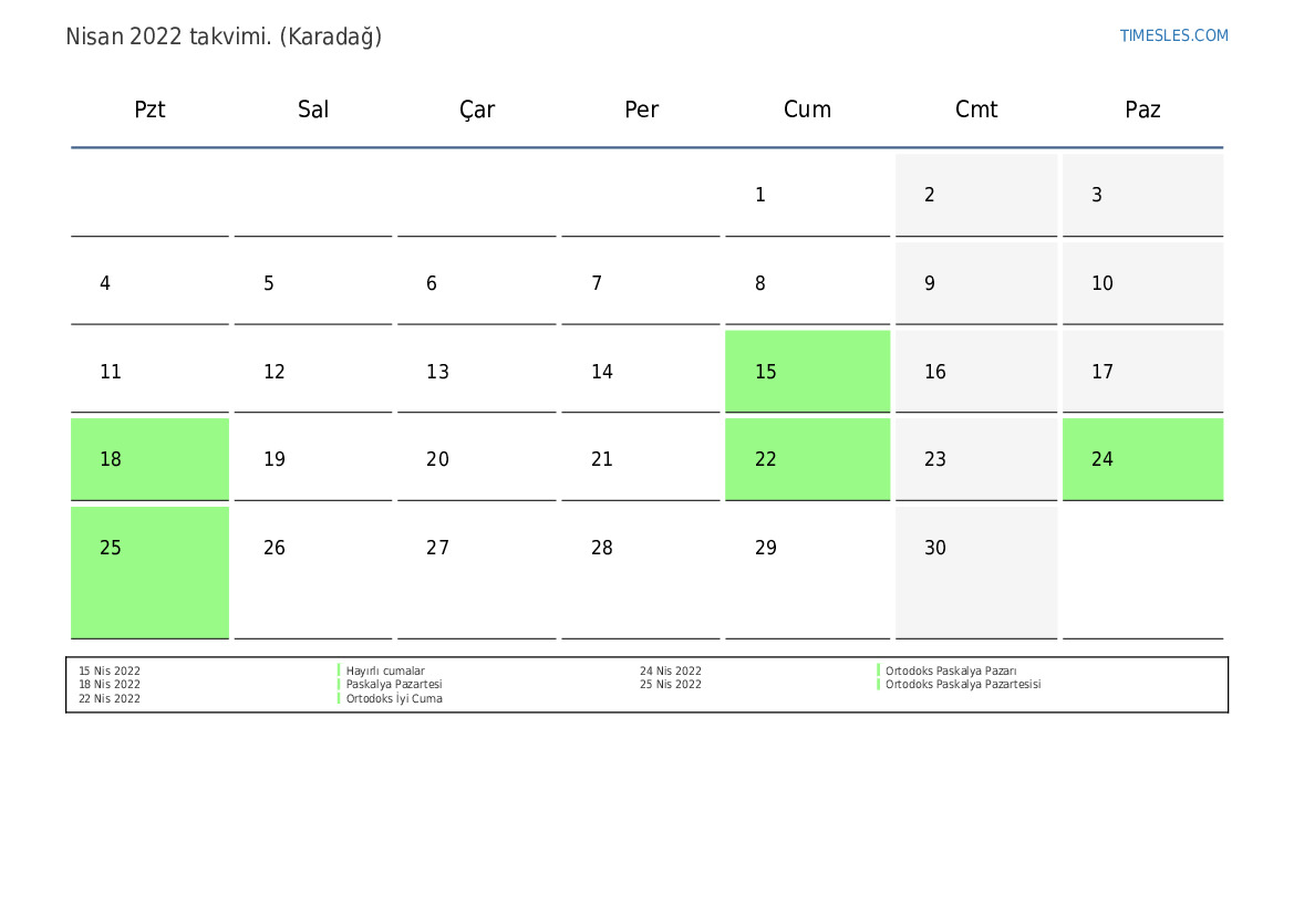 Karadağ için Nisan 2022 tatilleri ve hafta sonlarını içeren PDF takvimini indirin ve yazdırın
