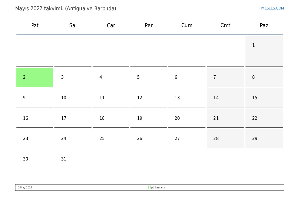 Antigua ve Barbuda için Mayıs 2022 tatilleri ve hafta sonlarını içeren PDF takvimini indirin ve yazdırın