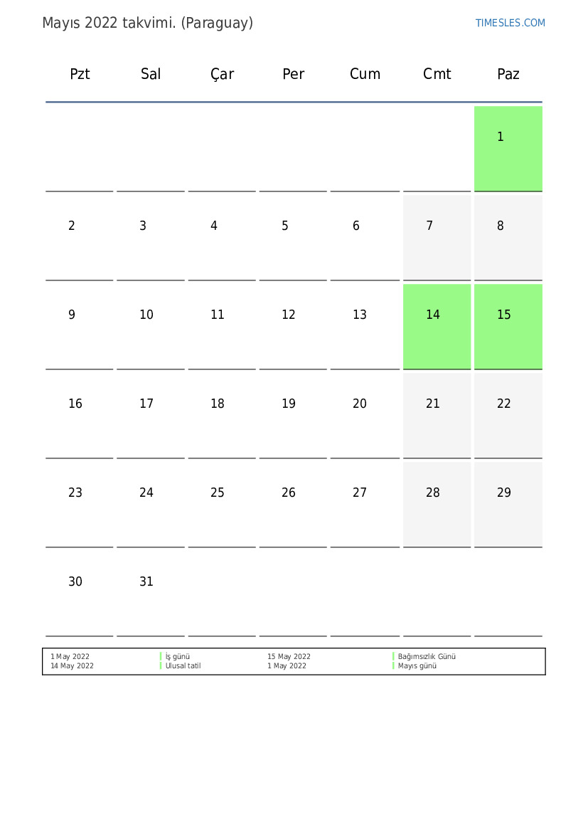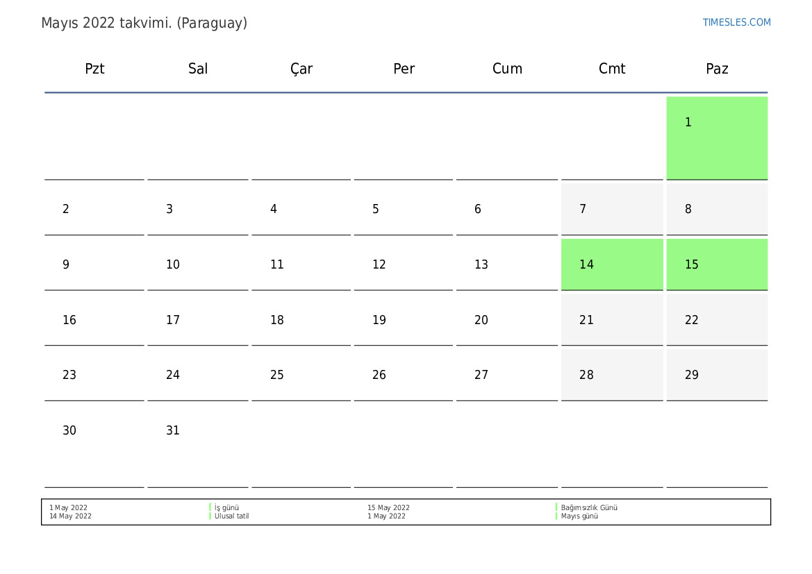 Paraguay için Mayıs 2022 Tatilleri ve Hafta Sonları Takvimi