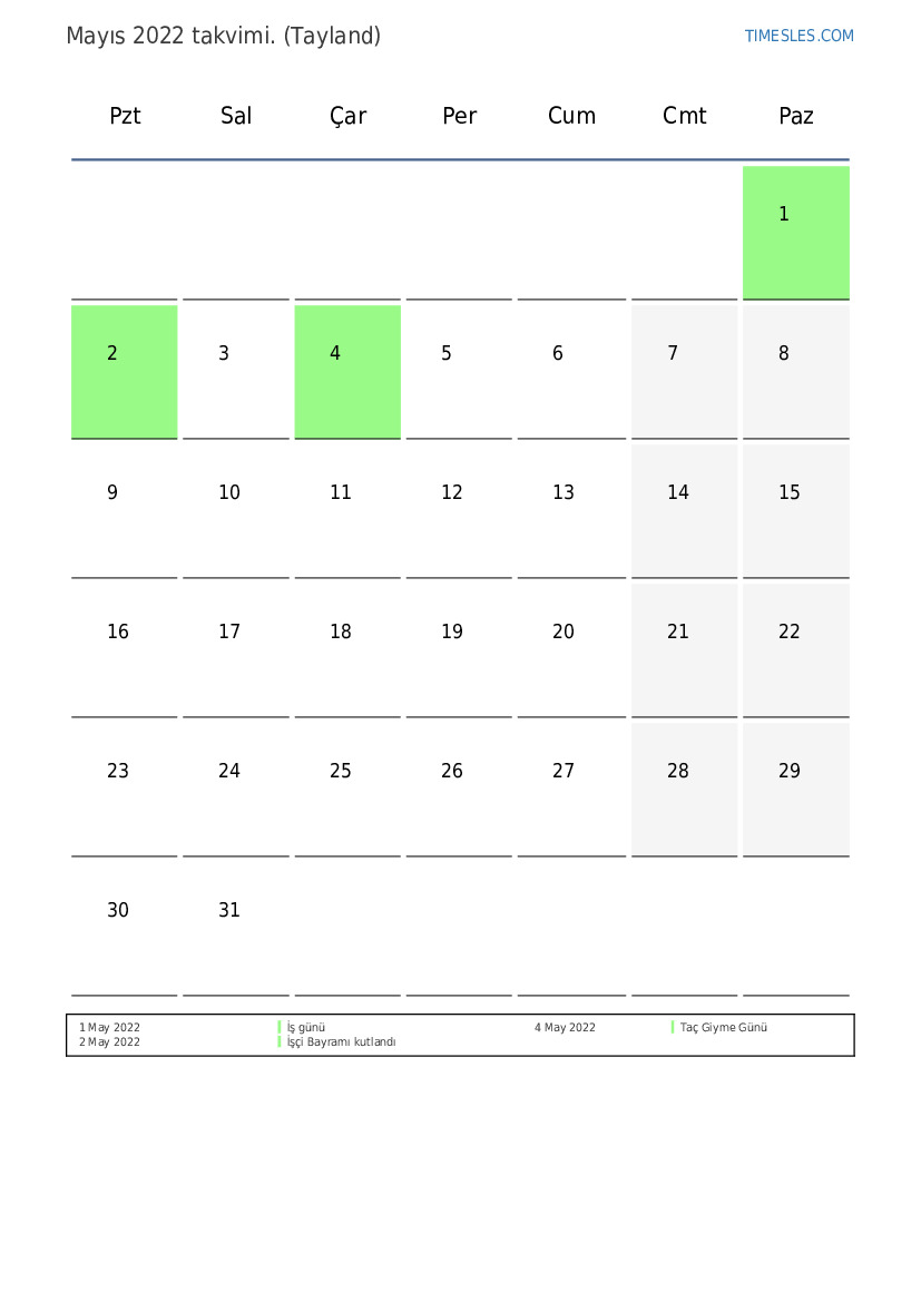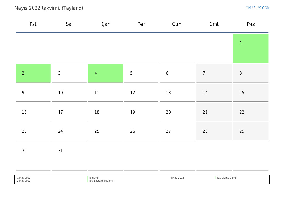 Tayland için Mayıs 2022 tatilleri ve hafta sonlarını içeren PDF takvimini indirin ve yazdırın