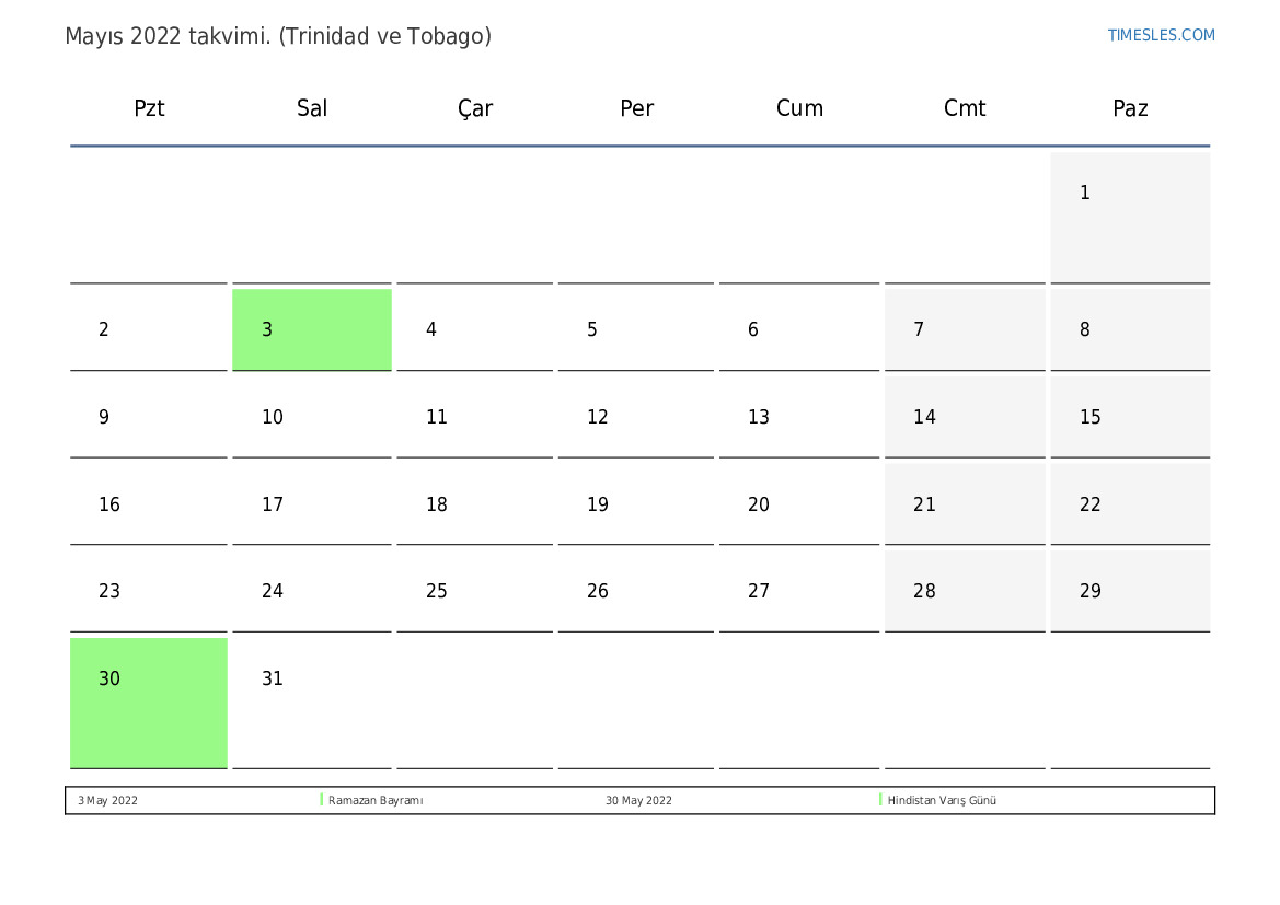 Trinidad ve Tobago için Mayıs 2022 Tatilleri ve Hafta Sonları Takvimi