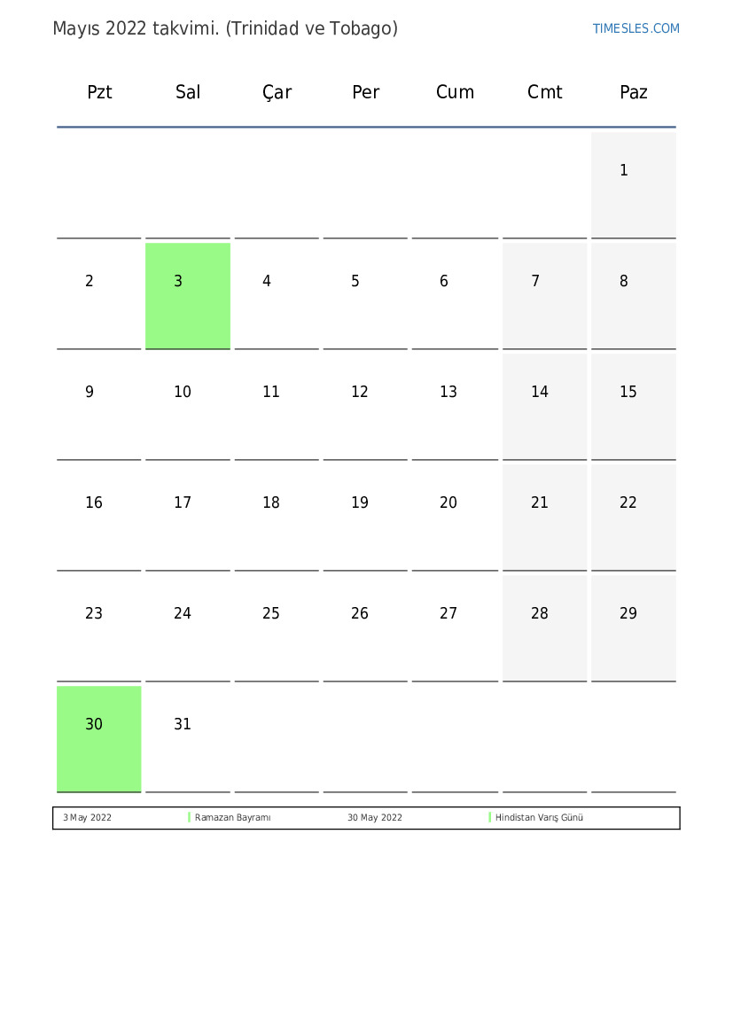 Trinidad ve Tobago için Mayıs 2022 tatilleri ve hafta sonlarını içeren PDF takvimini indirin ve yazdırın