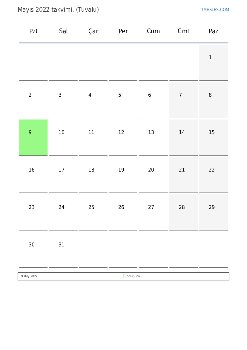 Tuvalu için Mayıs 2022 Tatilleri ve Hafta Sonları Takvimi