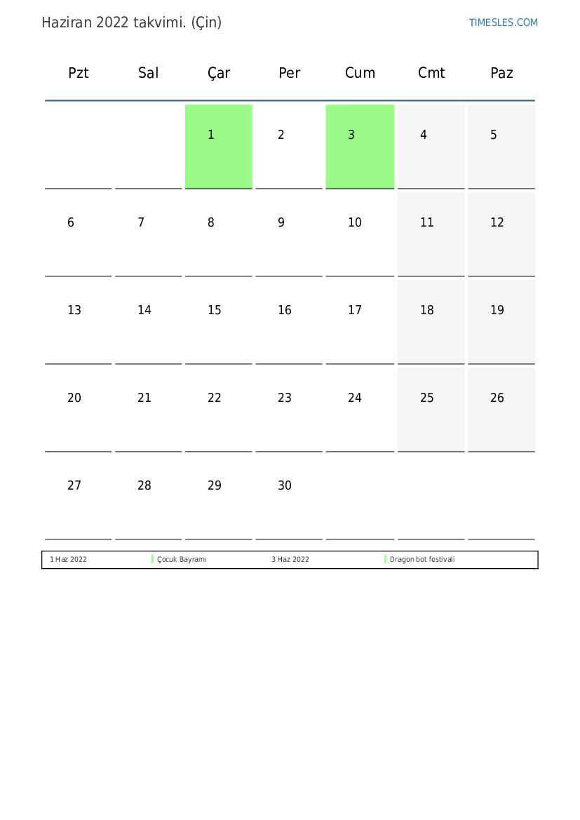 Çin için Haziran 2022 Tatilleri ve Hafta Sonları Takvimi