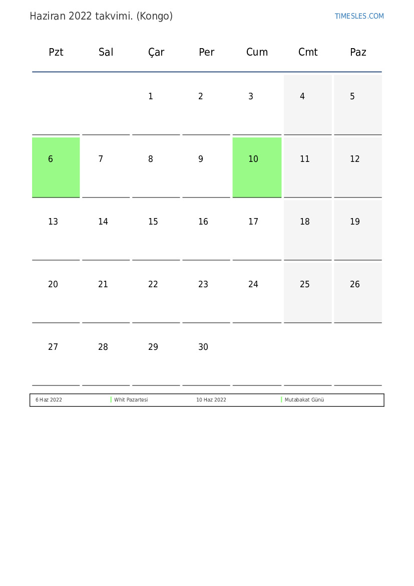 Kongo için Haziran 2022 tatilleri ve hafta sonlarını içeren PDF takvimini indirin ve yazdırın