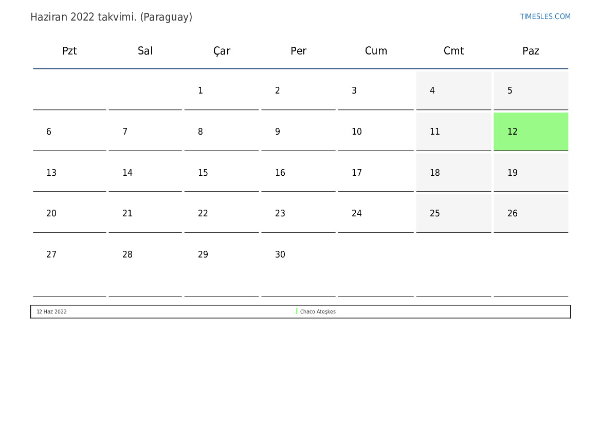 Paraguay için Haziran 2022 tatilleri ve hafta sonlarını içeren PDF takvimini indirin ve yazdırın